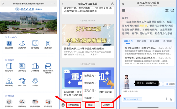 新版公众号聚焦数字化服务转型,打造“我的图书馆”“常用”“AI馆员”三大核心板块。“我的图书馆”集成“个人中心+微服务+微资源”,实现借阅查询、座位预约、数据库导航等十余项功能“一站式”整合,读者通过单一入口即可完成资源荐购、校外访问等操作,大幅提升移动服务效率。“常用”板块前置馆藏查询、活动广场、馆内动态等高频功能,助力读者秒级获取图书信息与馆内资讯。最引人注意的是移动端“AI馆员——雁灵析”,其融合DeepSeek、Kimi、豆包等多项技术引擎,集知识服务、资源导航、智能咨询于一体,可提供24小时智能问答、AI 翻译、AI 阅读、视频理解等多元服务,精准响应师生学术需求。